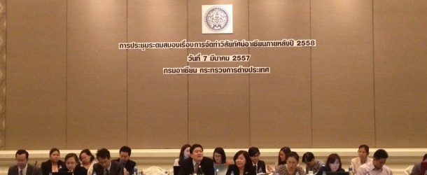 เมื่อวันศุกร์ที่ 7 มีนาคม 2557 กรมอาเซียน กระทรวงการต่างประเทศได้จัดการประชุมระดมสมองเรื่องการจัดทำวิสัยทัศน์ประชาคมอาเซียนภายหลังปี 2558 ณ โรงแรมพูลแมน คิงพาวเวอร์ ซึ่งมีผู้แทนจากหน่วยงานที่เกี่ยวข้องต่าง ๆ ทั้งหน่วยงานภายในและภายนอกกว่า 40หน่วยงานเข้าร่วม โดยมีนายอรรถยุทธ์ ศรีสมุทร อธิบดีกรมอาเซียน เป็นประธานในการประชุม